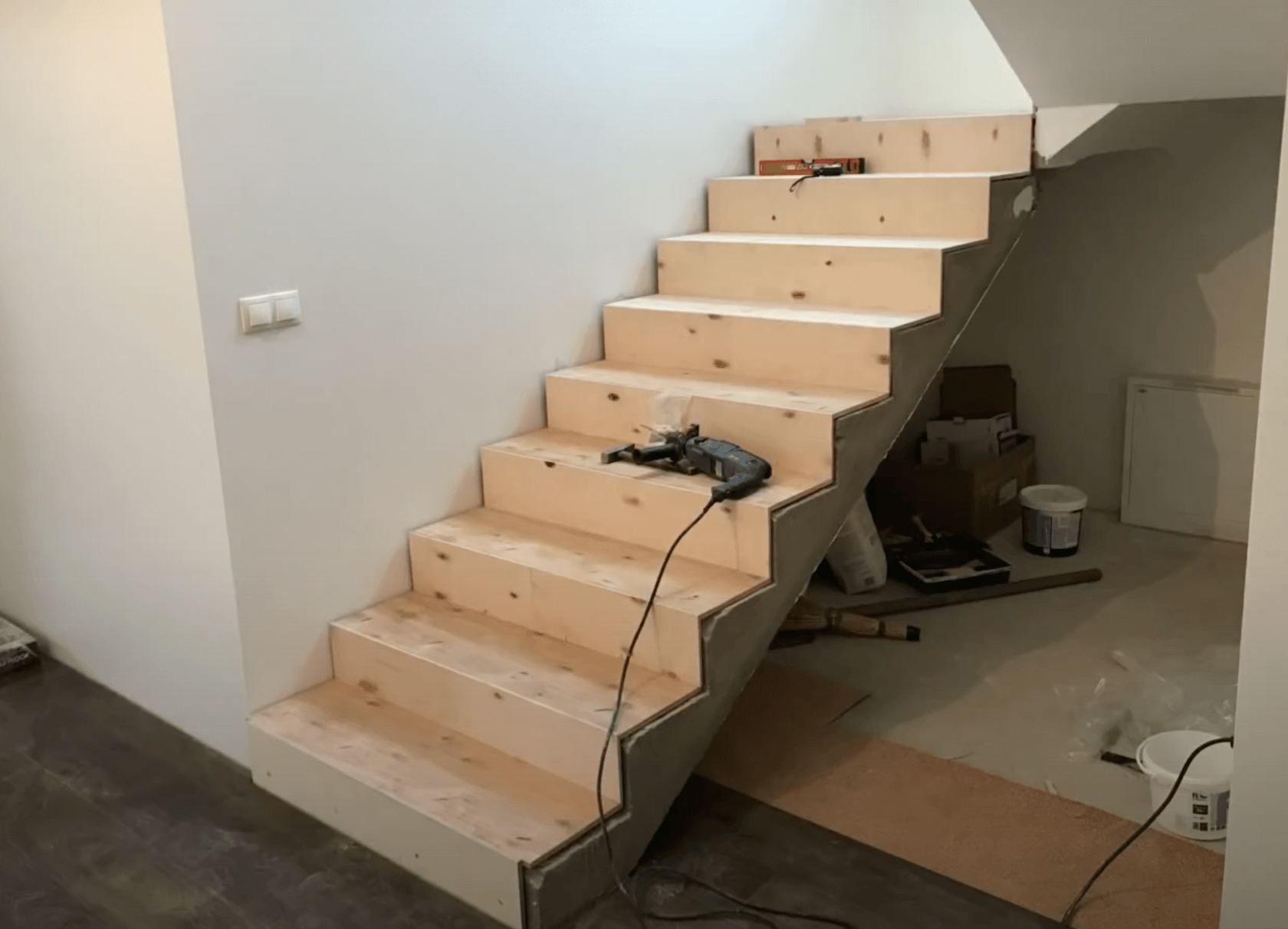 2. Укладываем фанеру на ступени и подступенники, толщиной 18-20мм, для придания идеально гладкой поверхности